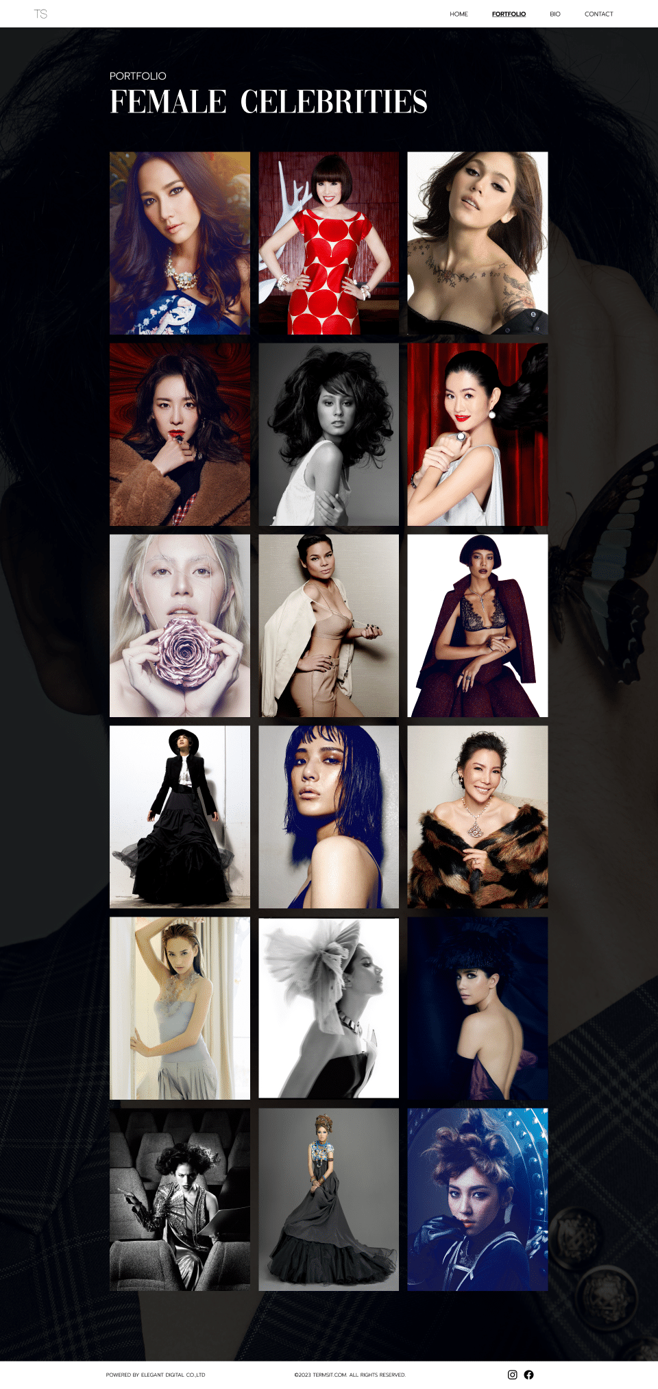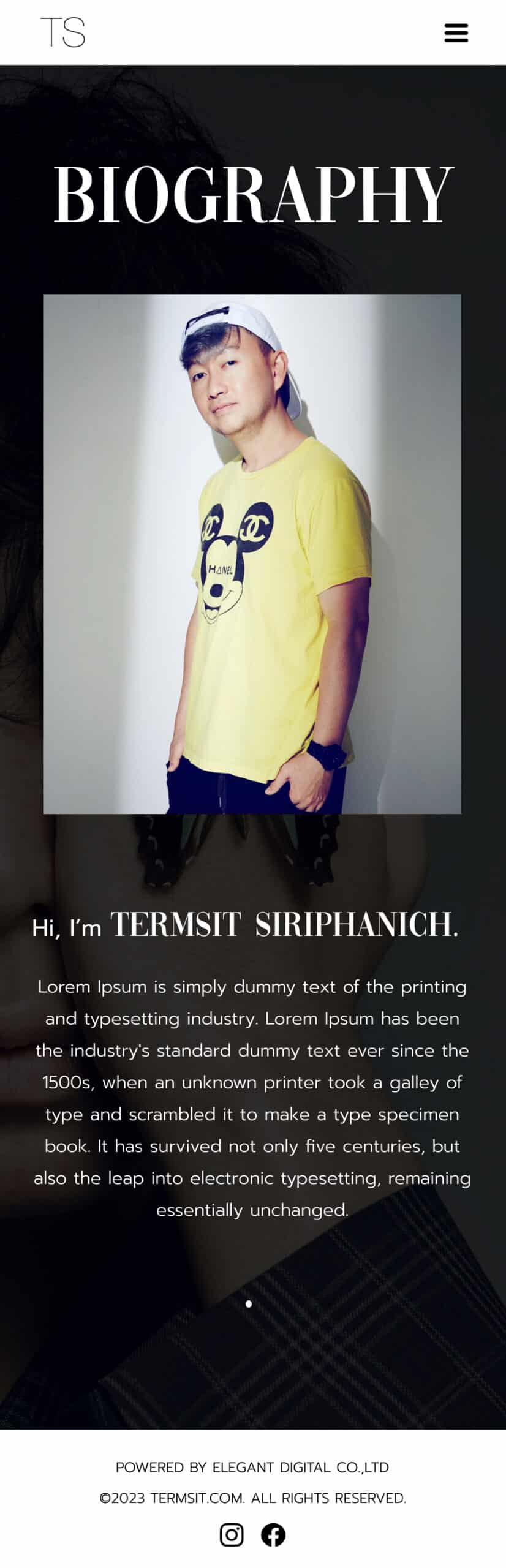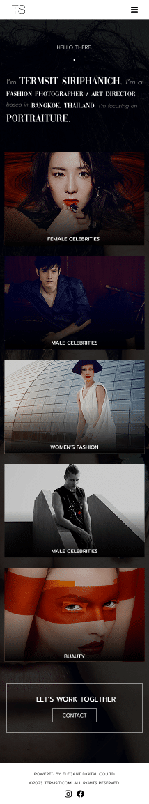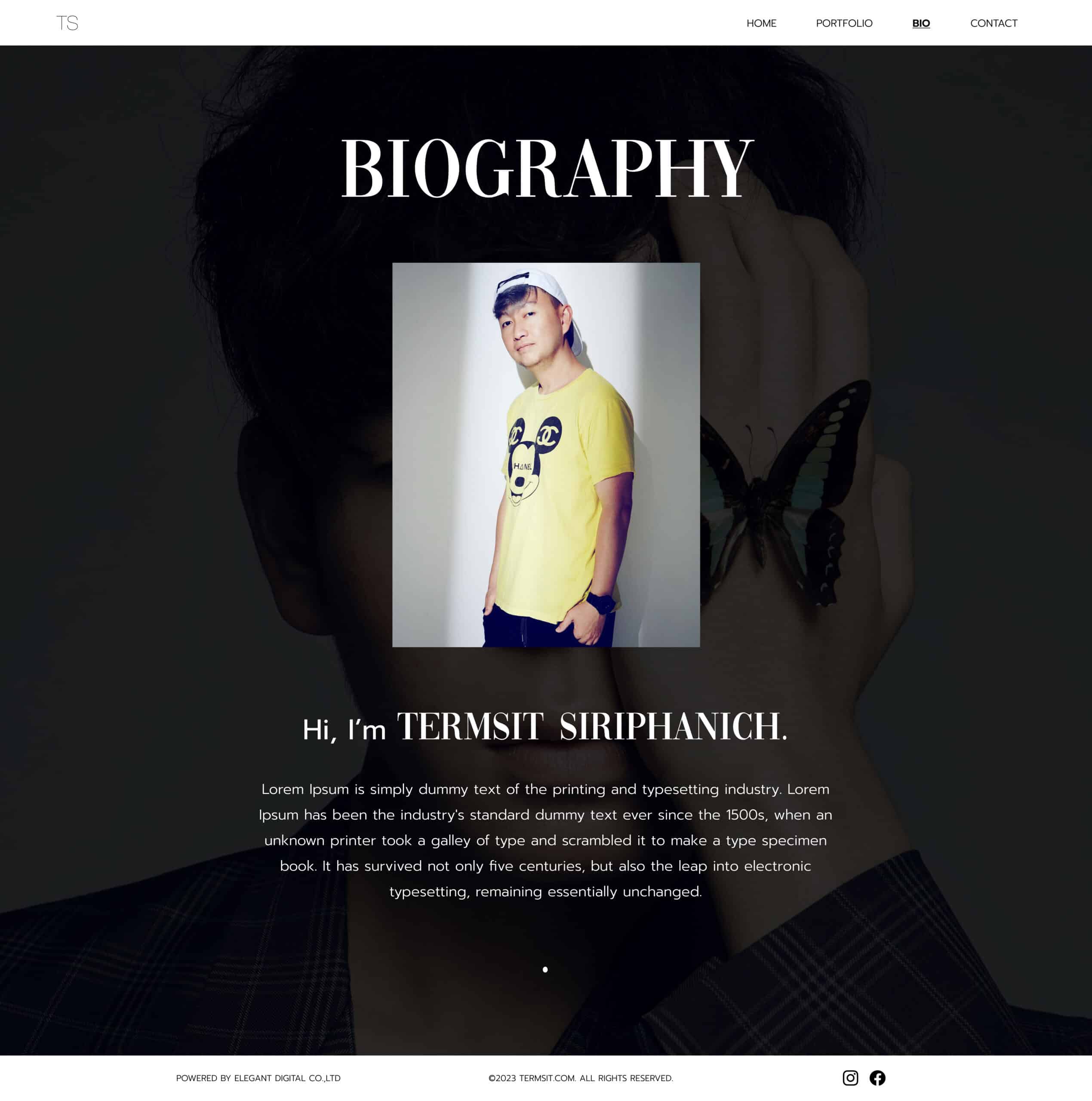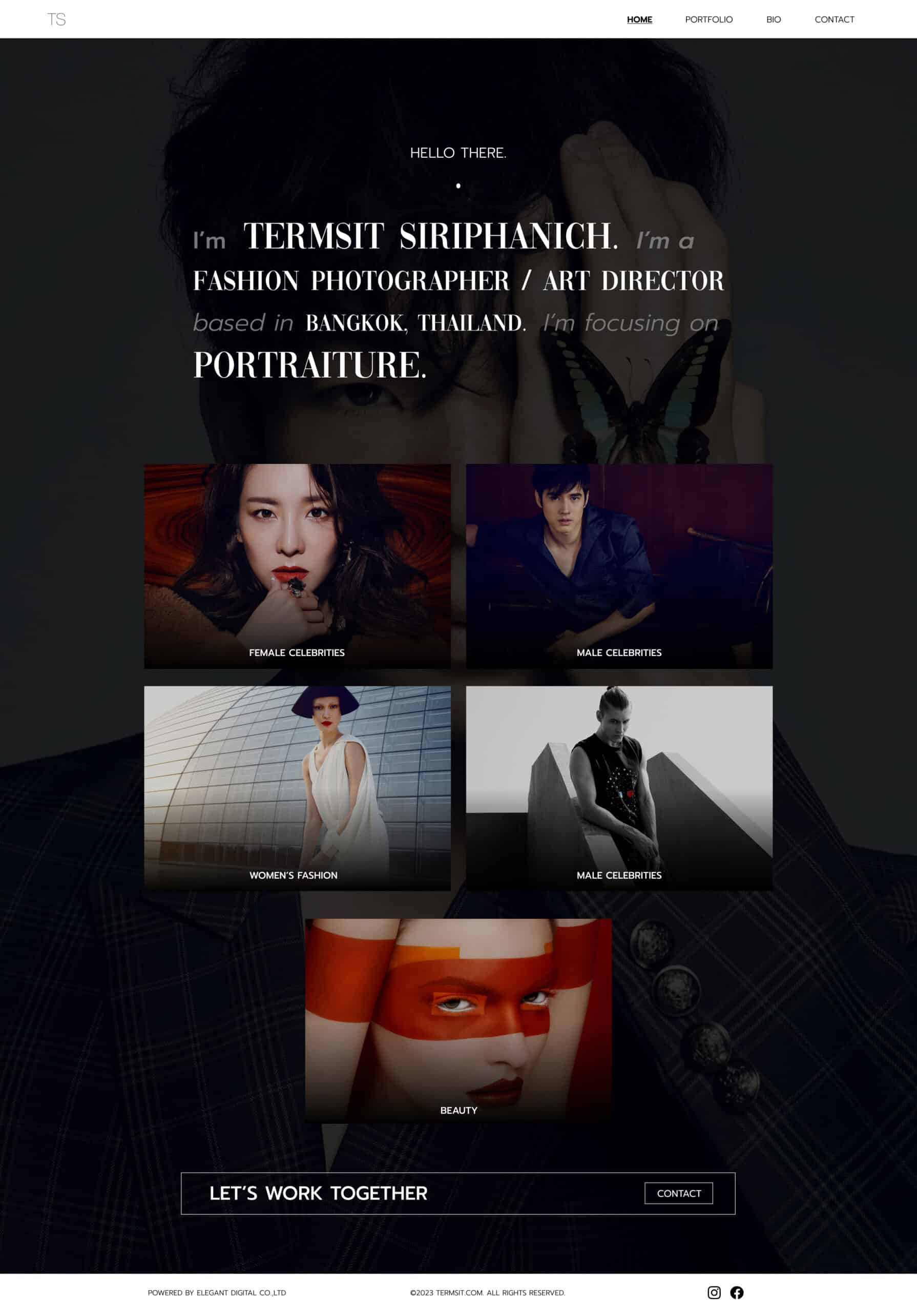 Portfolio / Biography / Contact, allowing visitors to access the work and story immediately.