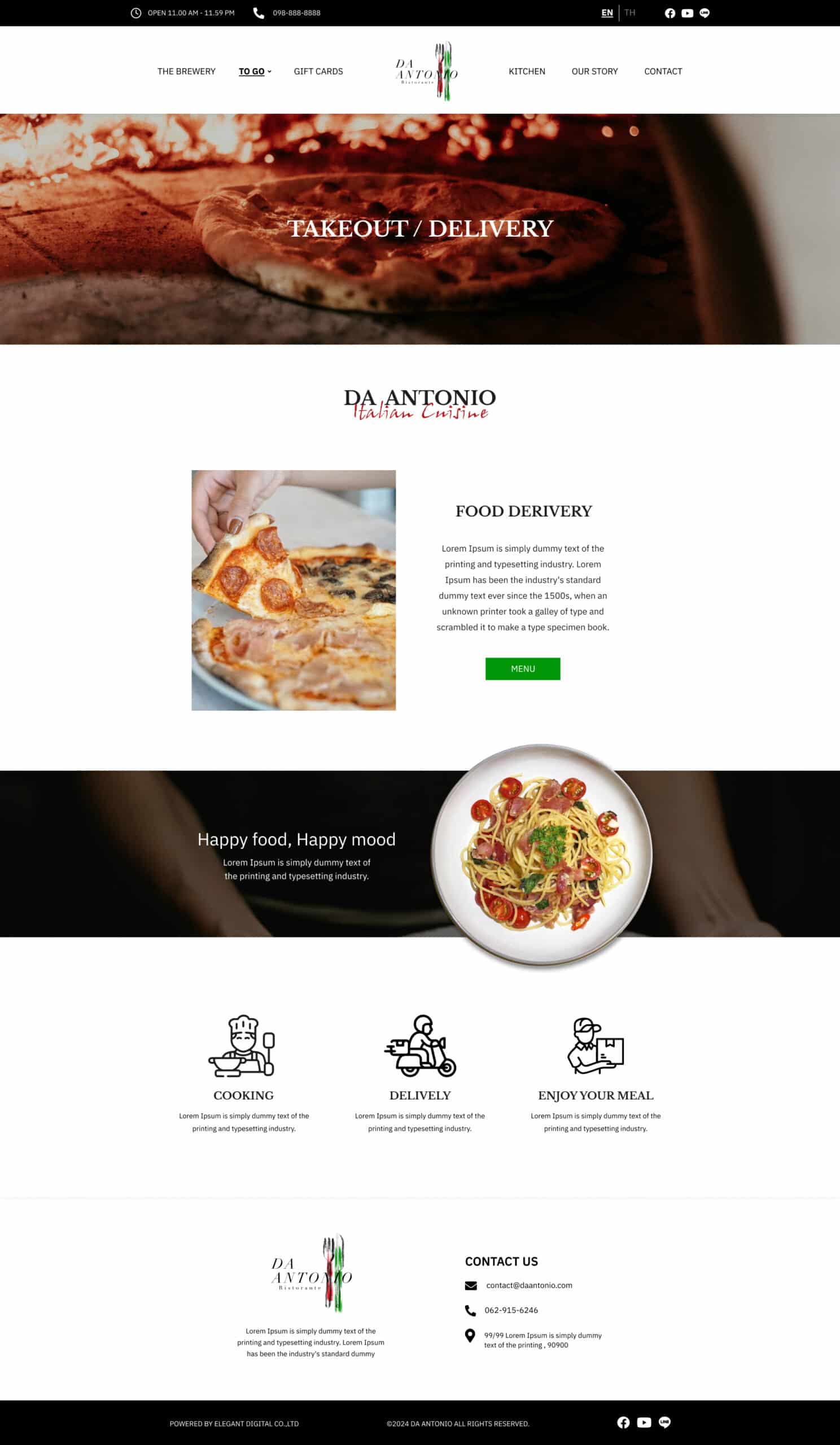 บรรยากาศร้านอาหารอิตาเลียนคุณภาพสูง ใช้ภาพใหญ่และพื้นที่สีอ่อนๆ เพื่อให้สายตาผู้ใช้โฟกัสที่เมนูและประสบการณ์ร้านทันที